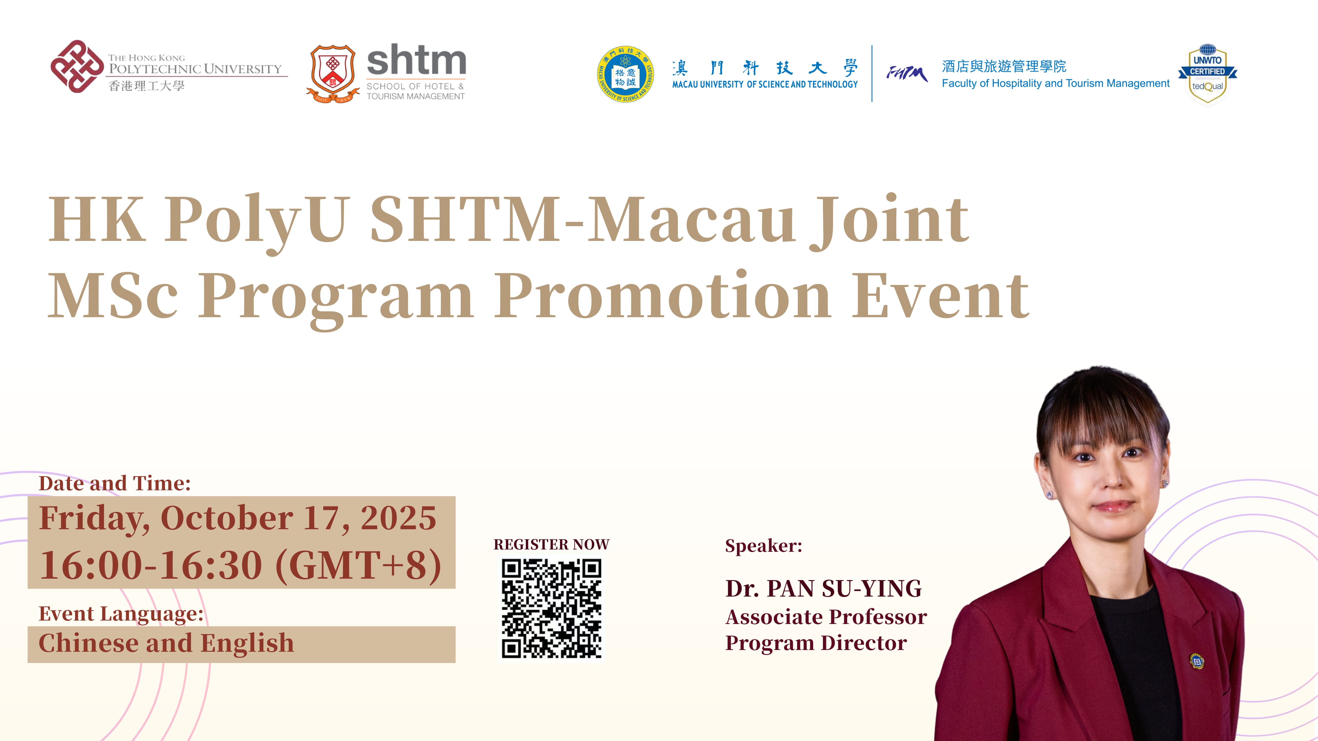 日期:4/25/2025(星期五)時間:10:30 - 12:00地點:D Hall主辦單位:澳門科技大學酒店與旅遊管理學院主講嘉賓:美高梅中國營運及拓展副總裁陳爰先生演講語言:英文 &nb...