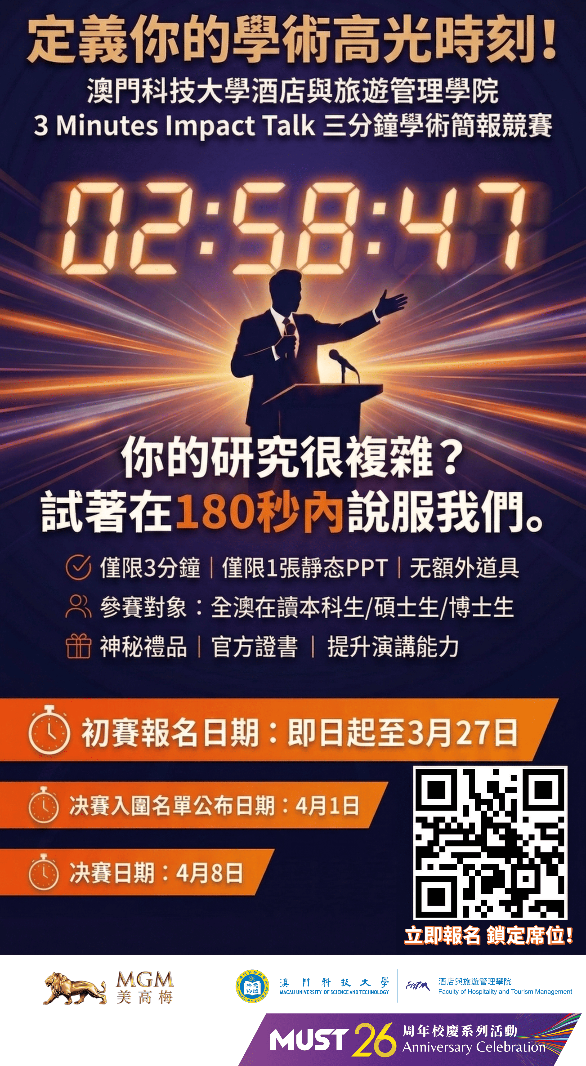 主办单位:澳门科技大学酒店与旅游管理学院、澳门美高梅 参赛对象:全澳在读本科生、硕士生、博士生一、竞赛目标与要求本次竞赛旨在为研究生及本科生创造学术交流平台,增强沟通能力,提升学生在学术演讲方面的技术...