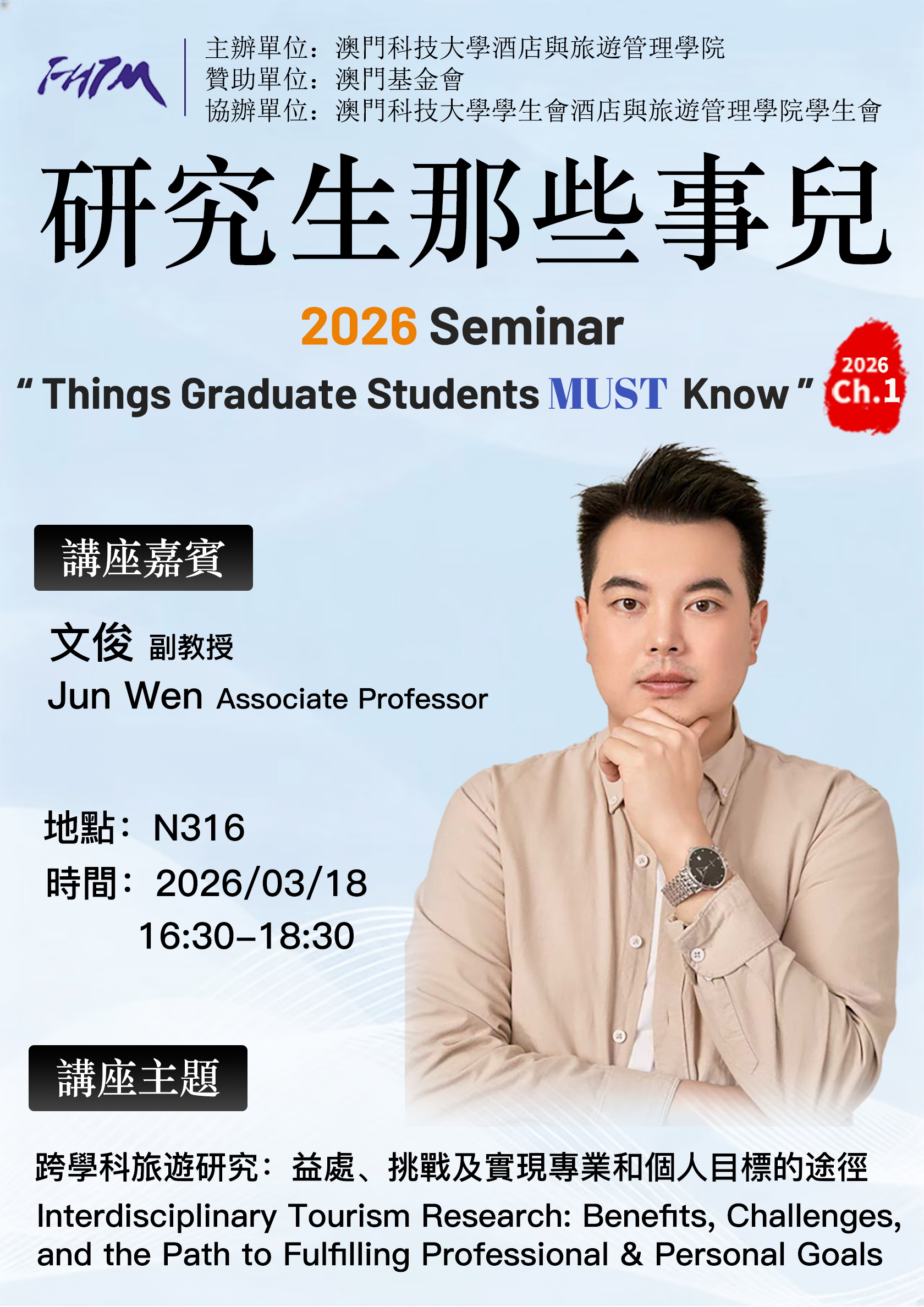 由澳门科技大学酒店与旅游管理学院主办、澳门科技大学酒店与旅游管理学院学生会协办的「2026研究生那些事儿——跨学科旅游研究:益处、挑战及实现专业和个人目标的途径」将于2026年3月18日举行,届时将邀...