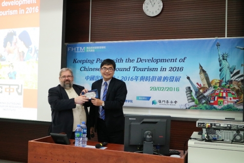 2016年 2月29日,酒店與旅遊管理學院榮幸邀請到Wolfgang Arlt教授蒞臨本院演講。Arlt教授來自德國的西海岸大學應用科學學院,他本次演講的主題為“中國出境旅遊:2016年與時俱進的發展”。Arlt教授是中國出境旅遊研究所COTRI的創始人, COTRI的辦公室位於漢堡市和北京(http://china-outbound.com/)。 Arlt教授出版了大量的著作, 大部份以中國的出境旅遊為主題。Arlt教授提出了近幾年中國出境旅遊和澳門旅遊的問題和發展前景。他與學生探討了各種問題。此次演講是酒店與旅遊管理學院研討會系列的一部分,並由澳門基金會贊助。