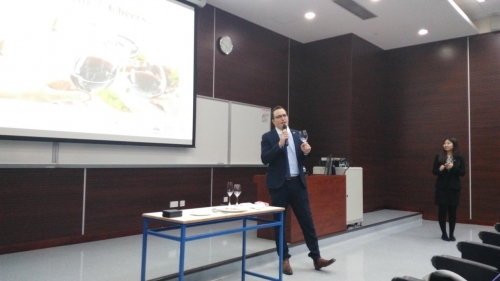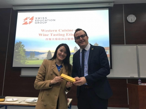 2016年3月30日,酒店與旅遊管理學院邀請了瑞士教育集團SEG亞洲區域經理Tim Ruding先生前來,為本院學生進行一場精彩的演講,主題為”西餐及葡萄酒品鑒禮儀”。Tim 向大家介紹了西餐用餐的基本禮儀及需要注意的小細節。同時也介紹了品酒的步驟,包括觀色、聞酒和品嘗。瞭解了西餐及葡萄酒品鑒禮儀後,SEG的Jacqueline還為大家講解了瑞士的酒店管理教育和分享了科大酒旅學生在瑞士讀研的生活。