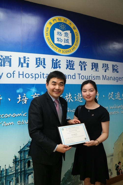 4月15日早上九點,徐馳同學來到學院辦公室與謝飛帆院長會面,簡單的介紹之後,開始跟隨謝院長參與到忙碌的工作討論中,高效有序地處理日常學院事務。後謝院長與徐馳同學前往迎接香港理工大學酒旅學院副院長Brian King教授的到訪,並一同參觀了校園及學院環境設施。中午,徐馳同學有幸邀請其一位朋友與謝院長在季節餐廳共進午餐。一起討論學院的教學改進和課程安排。Brian King教授於下午為我院師生帶來了精彩的演講,講座伊始謝院長向大家介紹了徐馳同學及“做一天院長”活動。講座結束後,謝院長、Brian King教授、我院教師、徐馳同學與恰逢到訪的台灣科技大學師生在季節餐廳進行簡短的會後座談交流。“做一日院長”活動體驗結束,謝院長親自為徐馳同學頒發了“做一天院長”精美證書。