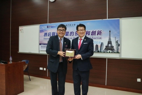 澳門科技大學酒店與旅遊管理學院謝飛帆院長 (左) 致送紀念品予田桂成講座教授