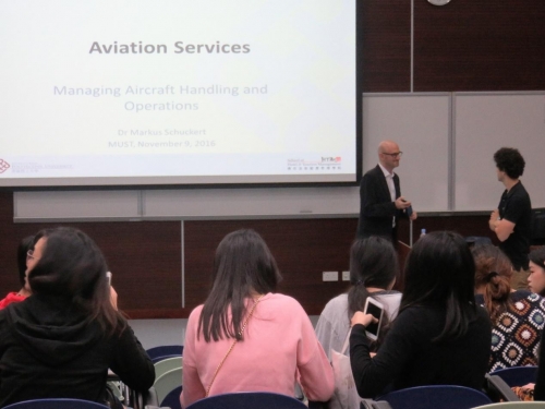 Schuckert博士的第一場講座名為“航空服務:管理飛機處理和運營”,該講座建立於他在航空業的豐富經驗,讓學生從實踐角度對航空服務運輸系統的有所認識。學生們表現出濃厚的興趣,提出了許多關於航空領域就業的相關問題。Schuckert博士的第二場講座名為“阿爾卑斯山度假村 -瑞士阿爾卑斯山安德馬特為例”,同學們對這場講座也表現出了同樣的熱情。Schuckert博士以瑞士一個世界級度假村振興了一個瑞士山村為例,而這正是他親自參與研究的一個項目。學生們對Schuckert博士在旅遊和酒店業的輝煌歷史感到興奮並留下深刻的印象,並傳達了將會追隨他在航空和度假行業的道路的精神。
