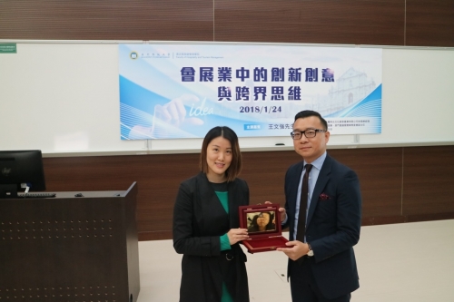 馮艷助理教授兼課程主任代表澳門科技大學酒店與旅遊管理學院向王文強先生致送紀念品