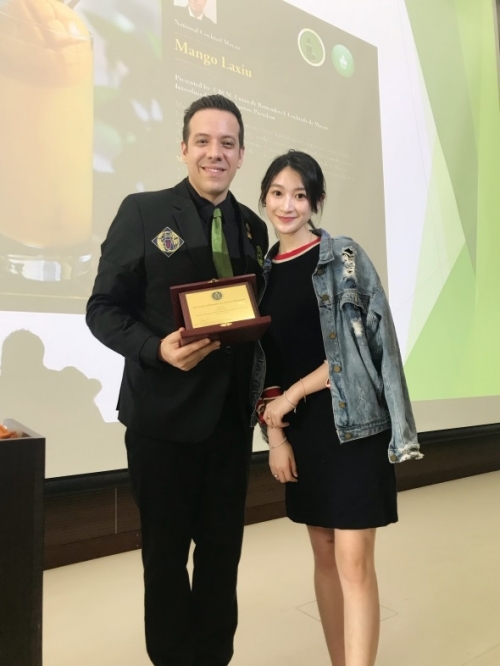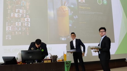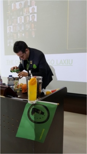 Mr. Bruno Santos首先向同學介紹調酒師的職業以及工作時會發生的突發狀況及處理方式,接著,他介紹了澳門雞尾酒調酒師協會的行程及發展歷史,以及澳門雞尾酒調酒師協會歷年來派代表參與國際調酒比賽的歷程。最後,Mr. Bruno Santos介紹了最能代表澳門的一款調酒”芒果辣椒”,並當場示範調製此款雞尾酒,此款雞尾酒也於2017年於國際調酒比賽中,為澳門贏得金牌。