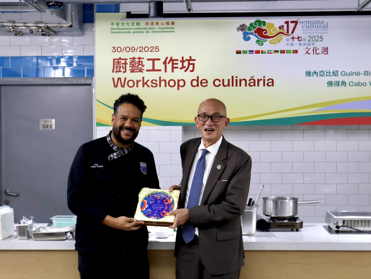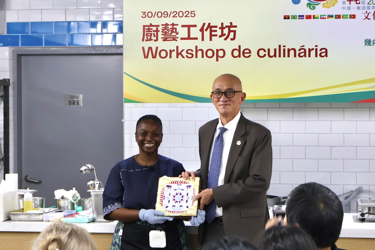 澳門科技大學酒店與旅遊管理學院與中國-葡語國家經貿合作論壇(澳門)常設秘書處於2025年9月30日連辦兩場「第十七屆中國-葡語國家文化週廚藝工作坊」,旨在充分發揮澳門中葡平台的重要作用,進一步推動中葡多元文化交流和民心相通。幾內亞比紹主廚Lassiatu Bana Djalo Balde與佛得角主廚Lamine Mascarenhas Medina受邀為澳科大酒店與旅遊管理學院學生示範廚藝技巧並分享心得,本次活動吸引逾80名酒旅學生參加。