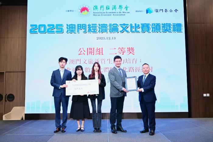 The award ceremony for the 15th Macao Economic Paper Competition, organized by the Macao Economic Association, was held on Saturday, December 13, 2025, in the banquet hall of the Macao Tower. Three teams from the Faculty of Hospitality and Tourism Management (FHTM) at the Macau University of Science and Technology (MUST) achieved excellent results, winning the Second Prize, Third Prize & Excellence Prize respectively.