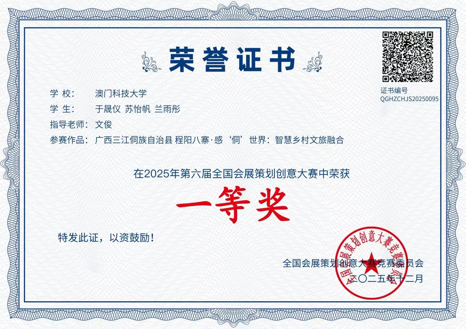 On November 22, 2025, the National Finals of the 6th National Exhibition Planning and Creativity Competition were grandly held, jointly organized by the Shanghai Conference and Exhibition Research Institute, the School of Journalism and Communication at Shanghai University, the College of Tourism and Service Management at Nankai University, the School of Broadcasting and Hosting Arts at Zhejiang University of Media and Communications, and the School of Tourism Management at Hangzhou Polytechnic. The team from the Faculty of Hospitality and Tourism Management (FHTM) at the Macau University of Science and Technology (MUST) delivered an outstanding performance in this competition. Standing out among over 2,500 domestic and international participating teams, the team was awarded the National First Prize. Associate Professor Wen Jun received the Excellent Supervisor award, while MUST was recognized as an Excellent Organizing Institution.