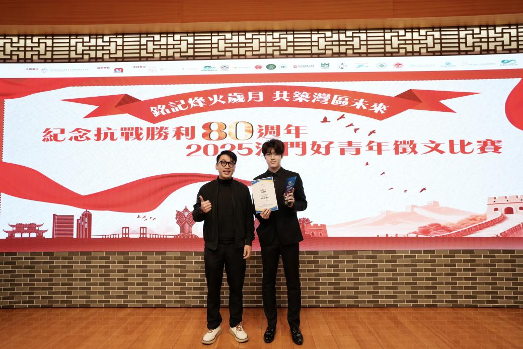 由澳门南海海外留学生联盟暨南海青年联会主办,澳门南海同乡会协办,澳门佛山社团总会、佛山市政协(各级)历届澳门委员联谊会、澳门中华教育会等多家单位支持的「铭记烽火岁月,共筑湾区未来-纪念抗战胜利80周年2025澳门好青年征文比赛」颁奖礼,于1月24日上午在青少年爱国爱澳教育基地二楼神州光影馆隆重举行。澳门科技大学酒店与旅游管理学院学生冯浩轩凭借作品「又见玉兰」斩获大学组银奖。学生事务处导师凌飞扬应邀出席颁奖礼,并与获奖学生合影留念。
