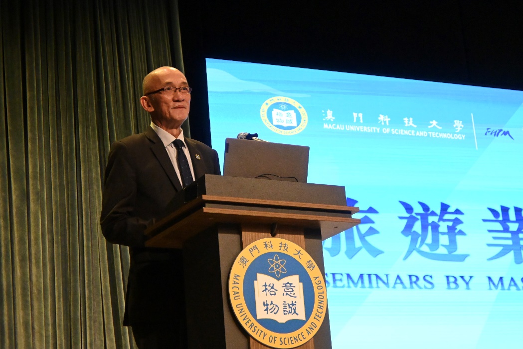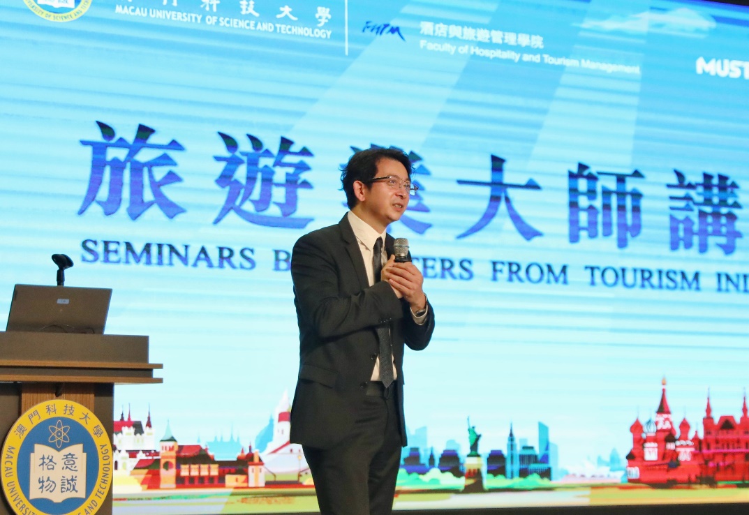 爲慶祝澳門科技大學26周年校慶,澳科大酒店與旅遊管理學院於2026年3月20日於D座禮堂舉辦第三場「旅遊業大師講座」。匯盈科技有限公司股東兼董事總經理洪于德先生主講題為《研學旅遊與賽事活動的關係》的講座。酒旅學院吳國民院長、黃穎祚助理院長、馮艷課程主任、潘思穎課程主任及師生約400人出席了活動。