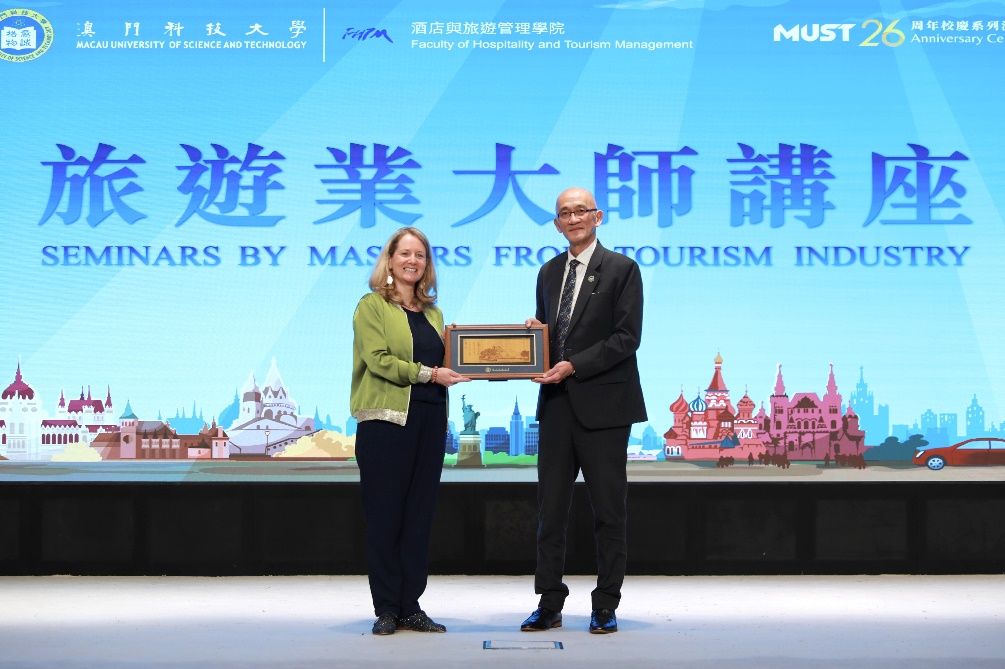 To celebrate the 26th anniversary of Macau University of Science and Technology, the Faculty of Hospitality and Tourism Management held the fifth "Tourism Industry Master Lecture" in the D hall on 2026 April 17. Ms. Claire Jollain, Academic Dean of HIM Business School, delivered a speech entitled " Meet the HENRY's." Dean Ben K. Goh, Program Director Feng Yan, Program Director Brenda Yang, Program Director Pan Su Ying and approximately 400 teachers and students attended this lecture.