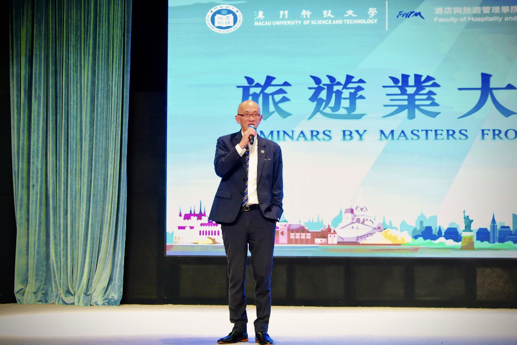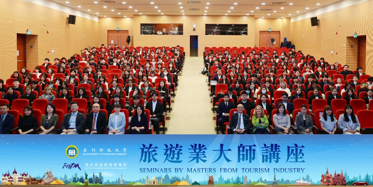 爲慶祝澳門科技大學26周年校慶,澳科大酒店與旅遊管理學院於2026年4月17日於D座禮堂舉辦第五場「旅遊業大師講座」。瑞士蒙特勒工商管理大學Claire Jollain院長主講題「潛力中產階級服務之道:走近高薪未富族」的講座。酒旅學院吳國民院長、馮艷課程主任、楊潔雲課程主任、潘思穎課程主任及師生約400人出席了活動。
